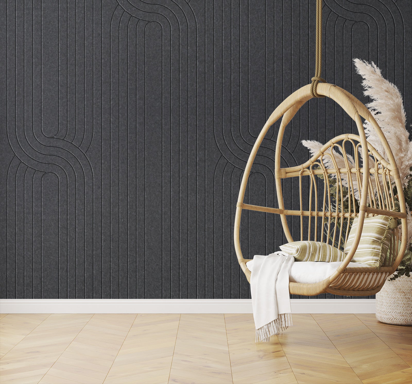 Panelen van plint tot plafond, zo maak je eenvoudig zelf van een saaie muur een design statement. Goed voor akoestiek en gemaakt van gerecyclede PET-flessen.