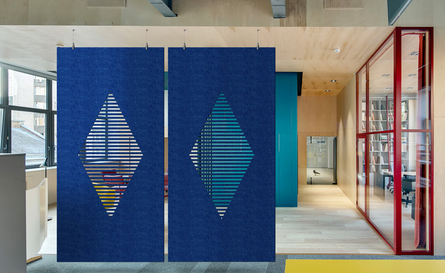 Het unieke ontwerp 'Diamond Strips' levert een verbetering van de akoestiek van elke ruimte. Gebruik het hangpaneel om ruimtes op te delen of als decoratie. Het wordt gemaakt in de afmeting 120 x 240 cm en 60 x 120 cm.